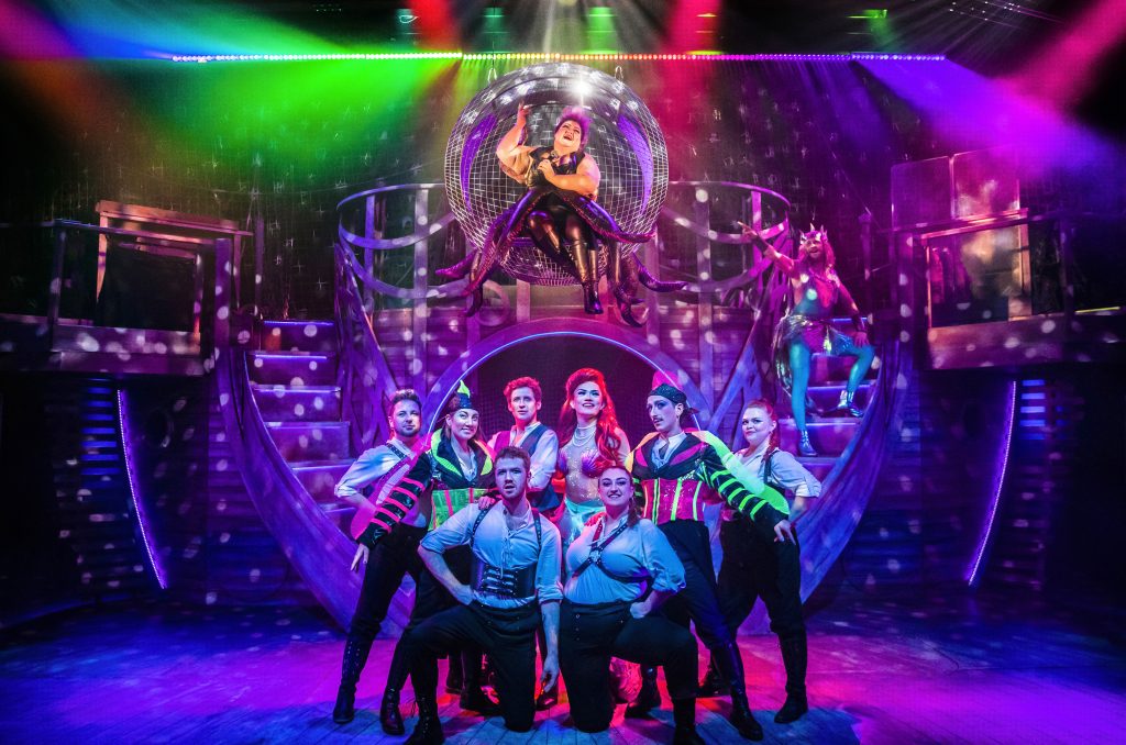 The puppets, costumes and set are all designed by Abby Clarke. The puppets add another dimension to the show and look really effective. The costumes – especially the fish tails – are excellent, and the set worked well as a huge ship bathed in lighting designer Adam King’s purple hue to match Ursula’s tentacles.